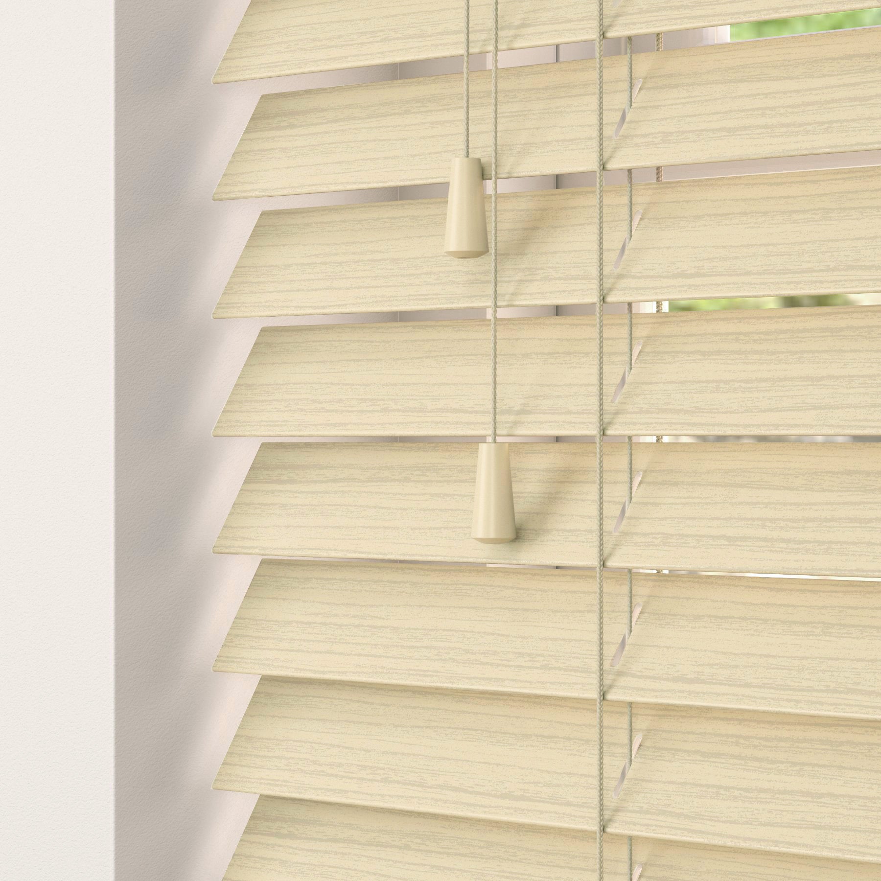 This Wood Essence made to measure features an alternative to real wood, is made from high-quality PVC, and is the perfect solution for bathrooms, kitchens, or areas of high moisture. This Wood Essence Blind has a 50mm slat size. Choose from a selection of stylish tones, from clean white and cream to natural wood colours or a textured fine grain slat. However, there are things to be aware of to ensure the blinds are suitable for your room or windows. Along with all blinds of this construction, the Wood Essence collection is not recommended for use in conservatories or sun rooms, as too much direct sunlight can cause the slats to warp slightly after prolonged sunlight.